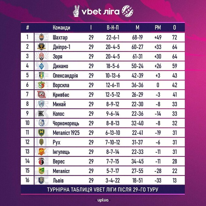 📊 Топ-7 УПЛ: Шахтер (72 очка), Днепр-1 (64), Заря (64), Динамо (59), Александрия (43), Ворскла (42), Кривбасс (41).