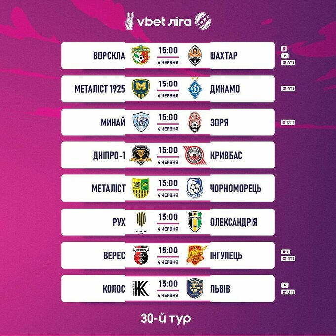 4 июня в 15:00 одновременно состоятся все 8 матчей 30-го тура УПЛ.