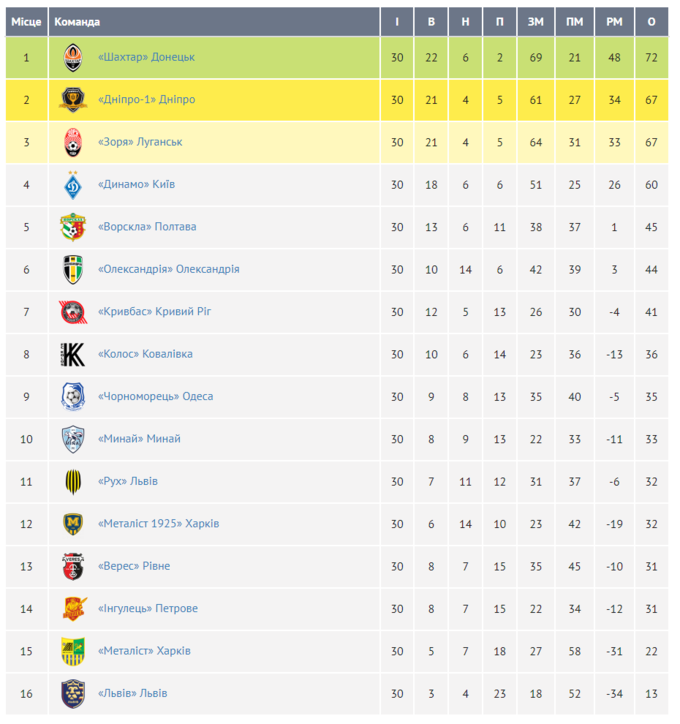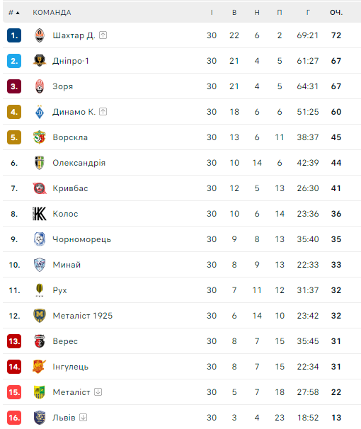 📊 Топ-5 УПЛ: Шахтер (72 очка), Днепр-1 (67), Заря (67), Динамо (60), Ворскла (45).