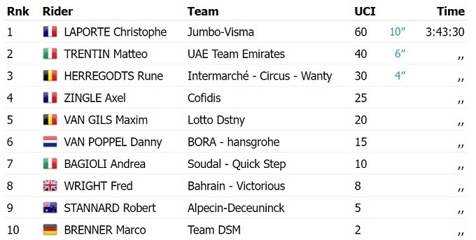 Французский велогонщик команды «Jumbo Visma» Кристоф Лапорт стал победителем первого этапа престижной многодневки Критериум Дофине. В финишном спринте он опередил итальянца Маттео Трентина из «UAE Emirates» и бельгийца Руне Херрегодтса из «Intermarche Wanty Gobert», который был участником отрыва дня.