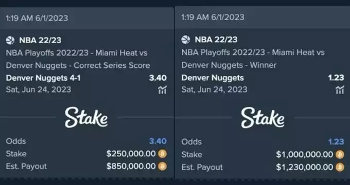 Исполнитель верит в успех «Денвер Наггетс». Дрейк сделал первую ставку в размере 1 миллиона долларов на победу этой команды в серии с коэффициентом 1.23. На вторую ставку артист выделил 250 000 долларов, поставив на победу этой же команды в серии со счетом 4-1 с коэффициентом 3.40. Чистыми Дрейк может заработать 830 000 долларов.