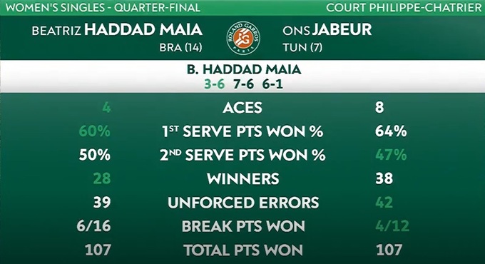 Беатрис Хаддад Майя (Бразилия) – Онс Жабер (Тунис) – 3:6, 7:6(5), 6:1