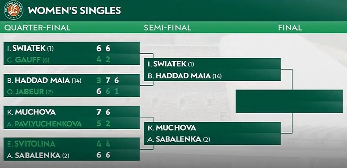 Отметим, что Ига в третий раз вышла в полуфинал грунтового мейджора. Оба предыдущих раза завершались взятием титула. Для сохранения статуса первой ракетки мира польке нужно выйти в финал, а также ожидать поражения Арины Соболенко в полуфинале против Каролины Муховой, или выигрывать турнир.