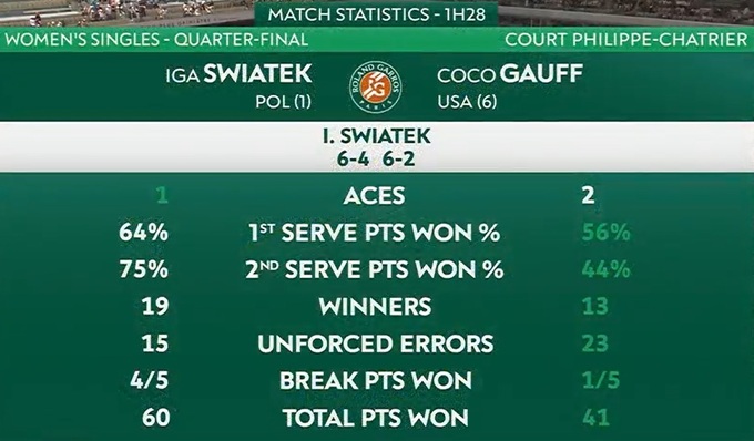 7 июня состоялся матч 1/4 финала Открытого чемпиона Франции по теннису, в котором лицом к лицу встретились прошлогодние финалистки Ига Свёнтек (№1 WTA) и Кори Гауфф (№6 WTA).