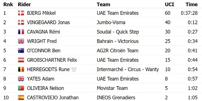 Датский велогонщик команды «UAE Emirates» Миккель Бьерг стал победителем четвертого этапа Критериума Дофине – гонки с раздельным стартом на 31 км. Он на 12 секунд опередил своего соотечественника Йонаса Вингегора из «Jumbo Visma». Топ-3 замкнул британец Фред Райт из «Bahrain Victorious».