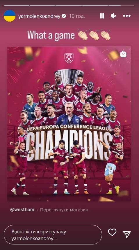Украинский полузащитник Андрей Ярмоленко отреагировал на победу «Вест Хэма» над «Фиорентиной» (2:1) в финале Лиги конференций.
