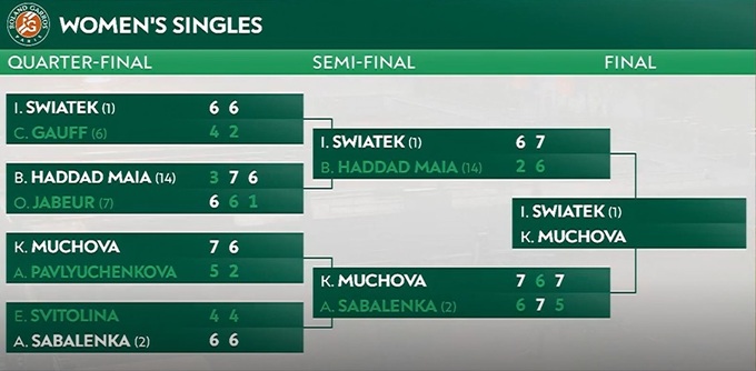 8 июня состоялся второй матч 1/2 финала Открытого чемпионата Франции по теннису в женском одиночном разряде, в котором Ига Свёнтек (№1 WTA) одолела Беатрис Хаддад Майю (№14 WTA).