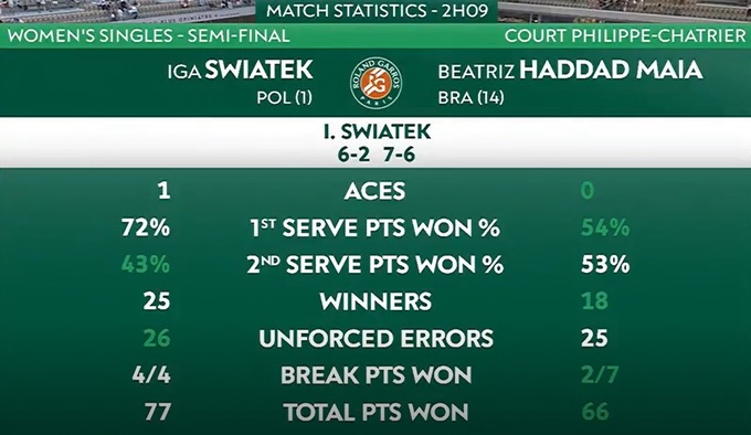 Ига Свёнтек (Польша) – Беатрис Хаддад Майя (Бразилия) – 6:2, 7:6(7)
