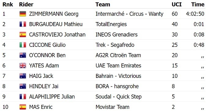Немецкий велогонщик команды «Intermarche Circus Wanty» Георг Циммерманн стал победителем шестого этапа многодневки Критериум Дофине-2023. В борьбе из отрыва он опередил француза Матье Бургадо из «Total Energies» и испанца Хонатана Кастровьехо из «Ineos Grenadiers».