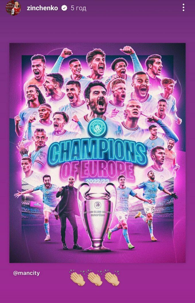 ФОТО. Зинченко поздравил Манчестер Сити с победой в Лиге чемпионов 2022/23