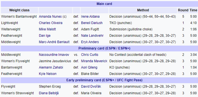 В главном бою вечера Аманда Нуньес из Бразилии (22–5) по очкам победила Ирен Алдану из Мексики (14–6) и защитила чемпионский пояс UFC в легчайшем весе.