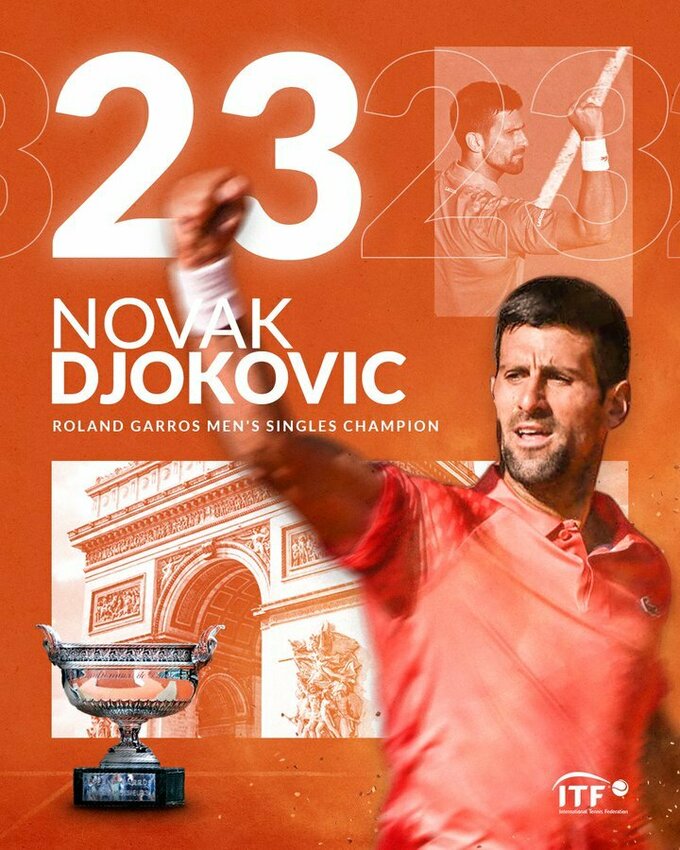 Сербский теннисист Новак Джокович победил норвежца Каспера Рууда в финале Ролан Гаррос (7:6, 6:3, 7:5) и выиграл свой 23-й титул на турнирах Grand Slam.