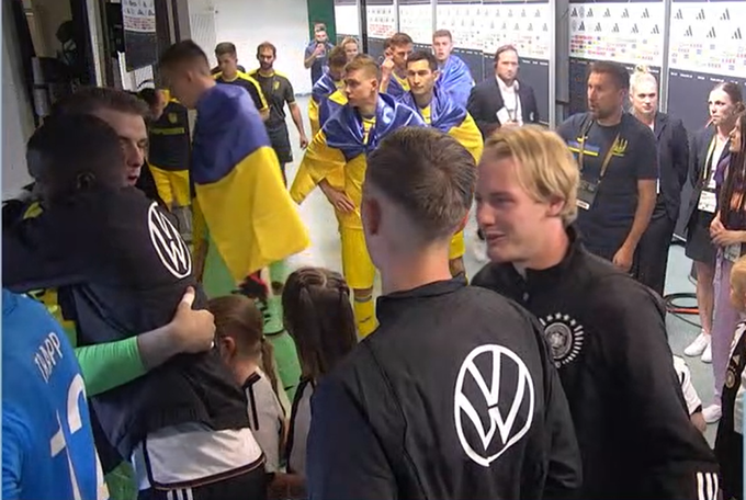 Перед началом поединка запасной голкипер сборной Украины Андрей Лунин по-дружески поздоровался с основным защитником Бундестим Антонио Рюдигером.