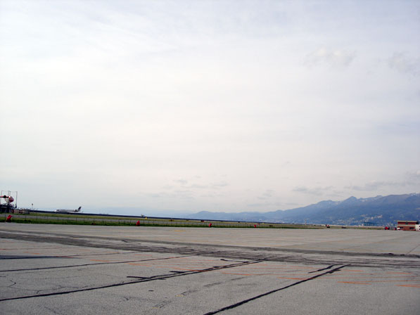 После этого мы продолжили перемещаться по катетам треугольника, связывающего Харьков, Анталию и Геную. Второй этап пути должен был составить чуть более 3 часов и действительно, около часа дня по вашему времени (и 12 по итальянскому) самолет стал медленно погружаться в повисшие над сапожным полуостровом белые и иногда пепельные облака. Под их покровом, как и ожидалось, расположилась Италия, достаточно симпатичная уже с этой высоты. Затем пошли Генуя, Лигурийское море и аэропорт, примостившийся прямо у воды. Видимо, город настолько портовый, что даже самолетам здесь нужно приземляться у моря, в общем, в слове аэропорт можно делать акцент на второй части.