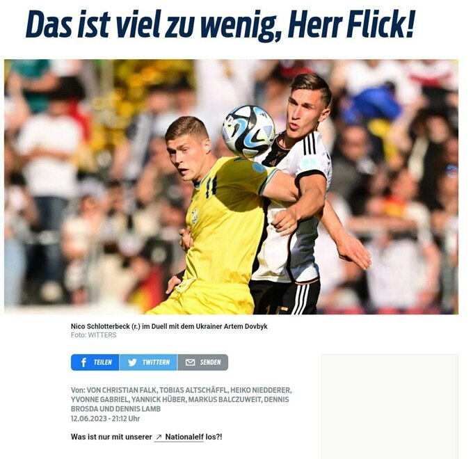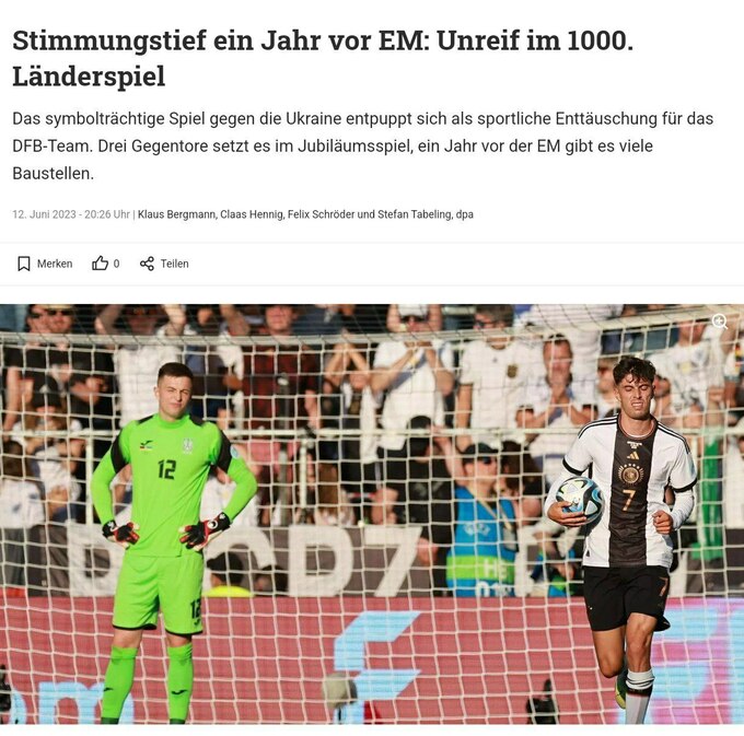 «Ханс-Дитер Флик и сборная Германии хотели использовать 1000-й международный матч в истории Бундестим, чтобы исправить слабое впечатление от мартовского теста против Бельгии (2:3) и, наконец, зажечь новый старт и надежду за год до чемпионата Европы у себя дома. После резко неуклюжего и неразборчивого выступления с Украиной со счетом 3:3 болельщики встревожены. Они опасаются, что домашний чемпионат Европы станет четвертым турнирным фиаско подряд. Прежде всего, эти мысли ставит под давление и нуждается в пояснениях тренера сборной, производившего недоуменное впечатление в кулуарах и сразу же покинувшего поле после финального свистка».