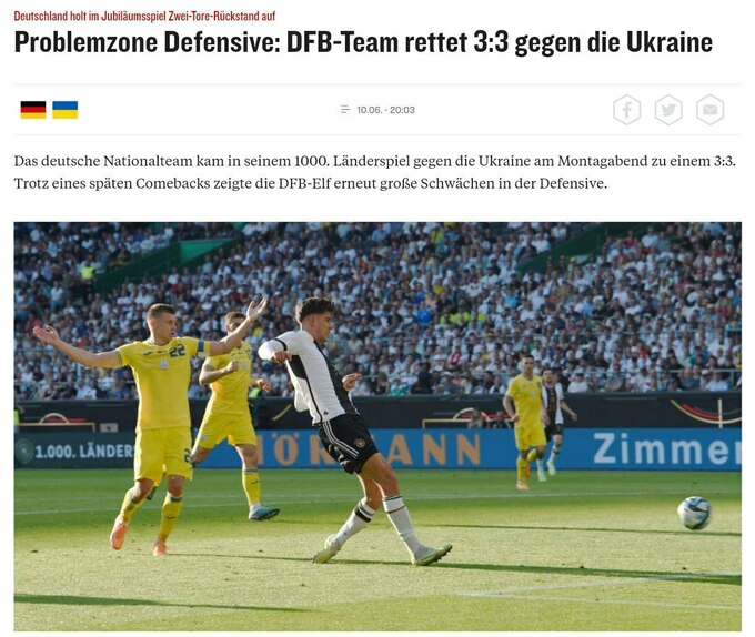 «Весьма символичная игра против Украины оборачивается спортивным разочарованием для команды DFB. В юбилейной игре три пропущенных мяча, за год до чемпионата Европы, так много «строительных» вопросов», – идется в подзаголовке к отчету.