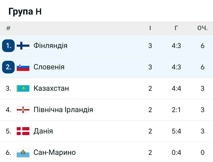 Сейчас сборная Финляндии занимает 1-е место в группе H. У команды 6 очков после 3 сыгранных матчей. Столько же пунктов имеет и Словения, но из-за личной встречи располагается на 2-й строчке. 3-е – 5-е место делят Казахстан, Северная Ирландия и Дания (у всех по 3 очка), а на последней 6-й позиции находится Сан-Марино с 0 очками.