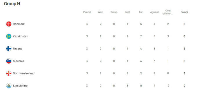 Сейчас в группе H первое место делят сразу четыре команды: Дания, Финляндия, Казахстан, Словения. У команд по 6 очков. Лидером является Дания из-за разницы забитых и пропущенных.