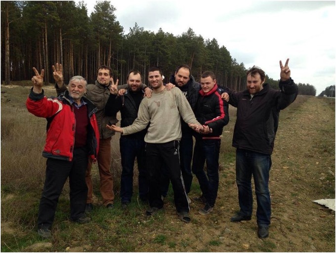 Крым-2014. Слева направо: Анатолий Ковальский, Михаил Вдовченко, Сергей Супрун, Юрий Шевченко, Алексей Гриценко, Максим Кривиденко, Андрей Щекун сразу после освобождения с плена