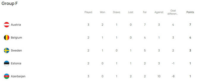 Сейчас в группе F на первом месте идет команда Австрии с 7 очками после 3 туров. На 2-й позиции расположилась Бельгия (4), а на 3-й – Швеция (3). 4-е и 5-е место делят Эстония и Азербайджан (по 1 очку).