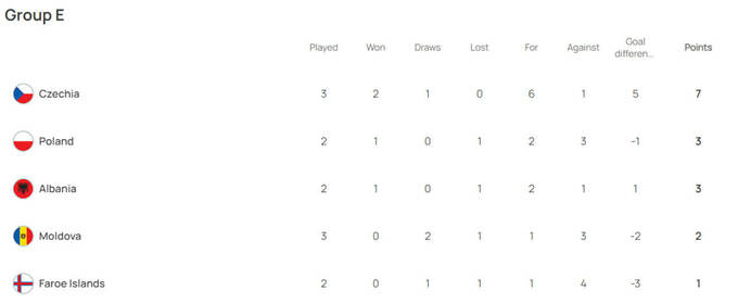 Чехи уверенно лидируют в группе, имея 7 пунктов. 2-е и 3-е место делят Польша и Албания (по 3 очка), на 4-м расположилась Молдова (2), а Фарерские острова – на 5-м (1).