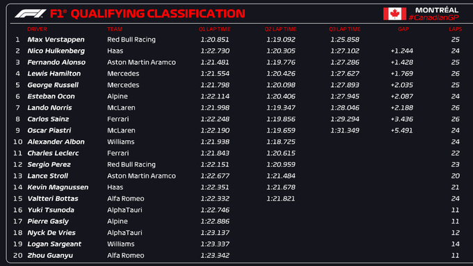 Топ-10: Ферстаппен, Хюлькенберг (+3 позиции штрафа), Алонсо, Хэмилтон, Расселл, Окон, Норрис, Сайнс, Пиастри, Албон