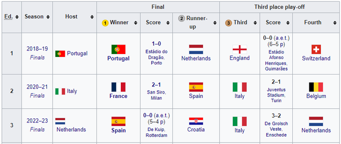 В Лиге наций различных сезонов побеждали Португалия, Франция и Испания.