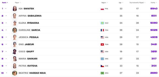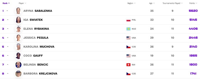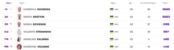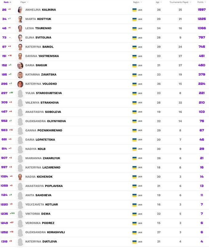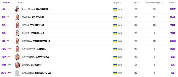 У лучших из украинок неделе была не самой удачной, но есть хорошие новости у остальных. Ангелина Калинина и Леся Цуренко опустились на одну строчку, Марта Костюк немного обновила личный рекорд, Элина Свитолина осталась на своем месте, а Катерина Байндл и Даяна Ястремская потеряли 4 и 16 мест позиций соответственно.