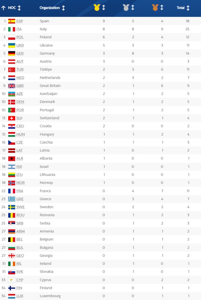 В топ-5 медальной таблицы Игр входят: Испания (9–5–4), Италия (8–8–9), Польша (6–2–4), Украина (5–3–3), Германия (3–8–3). Медали уже имеют 35 из 48 стран, которые принимают участие в соревнованиях.