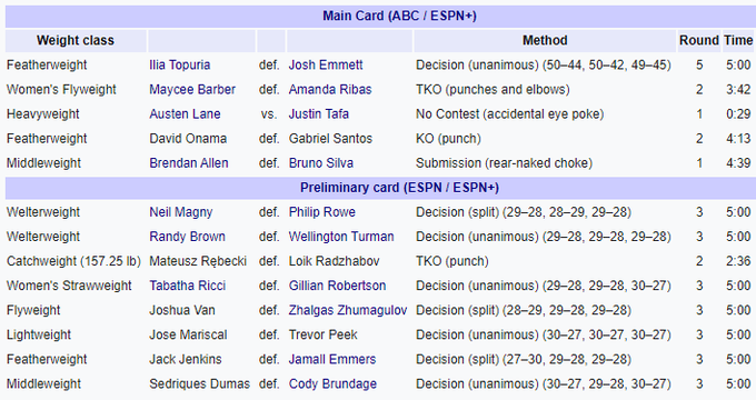 Топурия разгромно победил Эмметта, избив лицо соперника до крови. В своей карьере он идет без поражений, это 14-я его победа в октагоне.