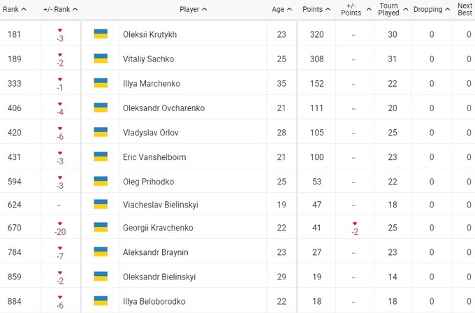 Украинские мужчины ничем не порадовали и практически все опустились в рейтинге.