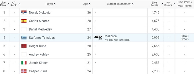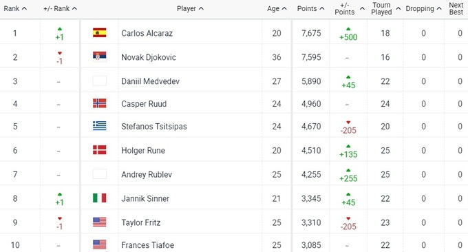 В первой десятке состоялось еще одно изменение – Янник Синнер опередил Тэйлора Фритца.