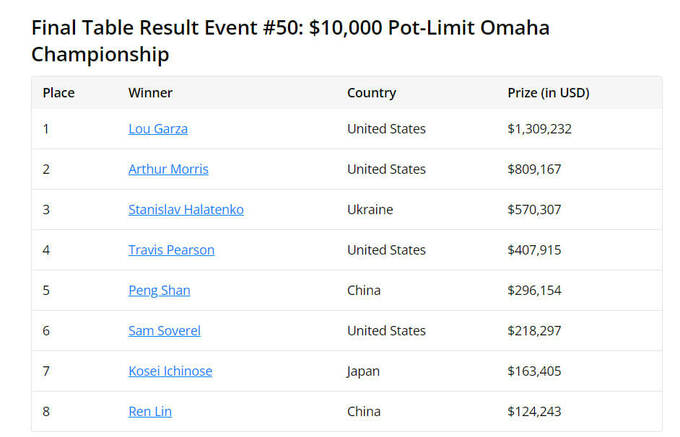 Мировая серия покера 2023 года в клубе Horseshoe and Paris Las Vegas вошла во вторую половину фестиваля, определив победителя в рекордном событии №50: чемпионат по Омахе с бай-ином 10 000 долларов. Из 731 заявки двое техасцев разделили наибольшую часть призового фонда в размере 6 798 300 долларов. Ап Луи Лу Гарза победил в недолгой хедз-ап дуэли с Артуром Моррисом.