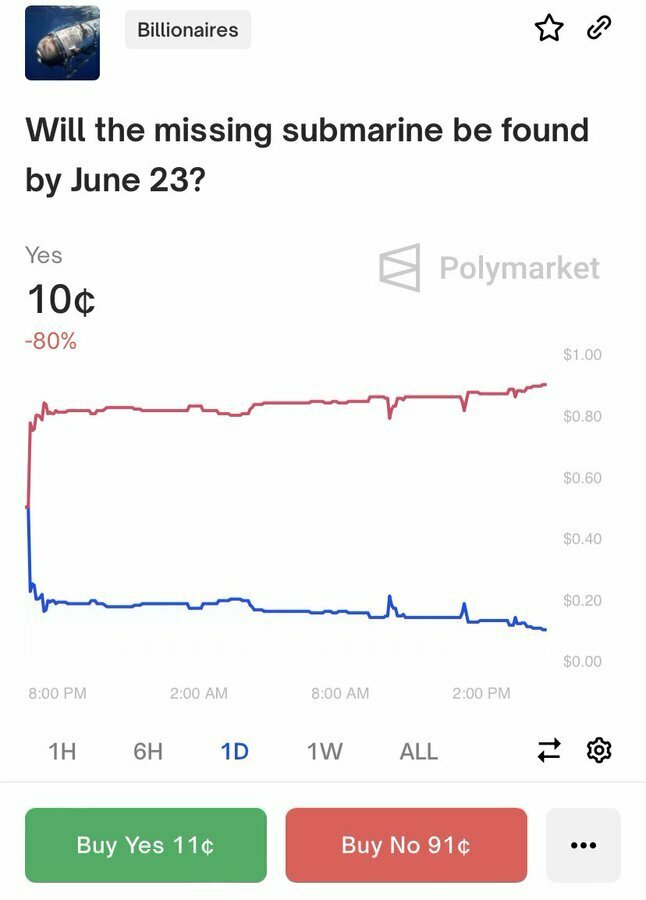 Множество пользователей онлайн-рынка прогнозов Polymarket сделали ставки на десятки тысяч долларов на то, будет ли пропавший без вести туристический подводный аппарат под названием «Титан» найден к полуночи по восточному времени 23 июня, и в этот момент, вероятно, пять пассажиров на борту будут обнаружены живыми, или у них закончится кислород.