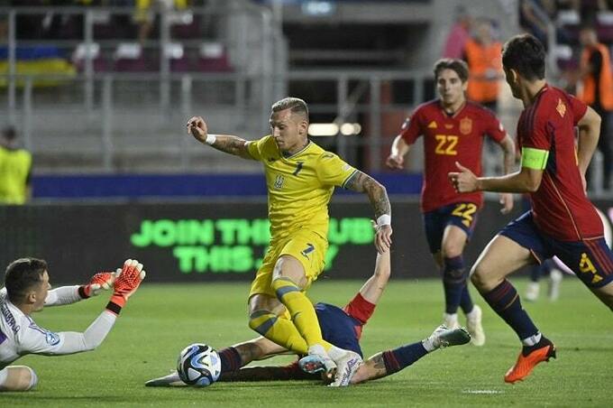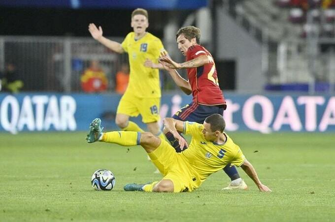 В первой половине первого тайма наша сборная вела игру, действовала первым номером, при потере мяча сразу прессинговала. Приблизительно с 30-й минуты скорость комбинационных действий у обеих команд снизилась. Зато испанцы чаще начали ускоряться индивидуально. И это создавало проблемы для нашей команды. Пиренейцы в борьбе один в один на скорости проходили украинцев, но за счет подстраховки наша сборная ликвидировала эти опасные проходы.