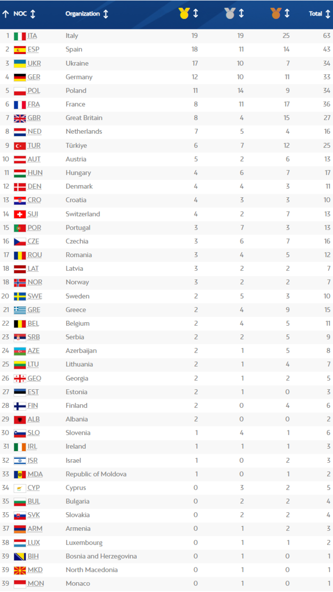 В топ-5 медальной таблицы Игр входят: Италия (19–19–25), Испания (18–11–14), Украина (17–10–7), Германия (12–10–11), Польша (11–14–9). Медали имеют 41 из 48 стран, которые принимают участие в соревнованиях.