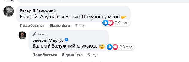 «Валерий, ану оделся быстро. Получишь у меня», — написал Залужный. «Слушаюсь», – ответил Маркус.