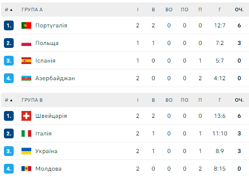 - Группа В: Швейцария, Италия, Молдова, Украина.