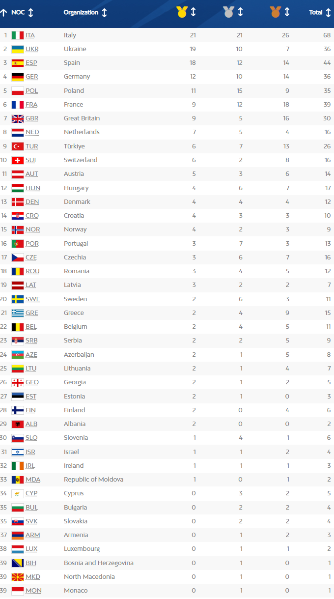 В топ-5 медальной таблицы Игр входят: Италия (21–21–26), Украина (19–10–7), Испания (18–12–14), Германия (12–10–14), Польша (11–15–9).