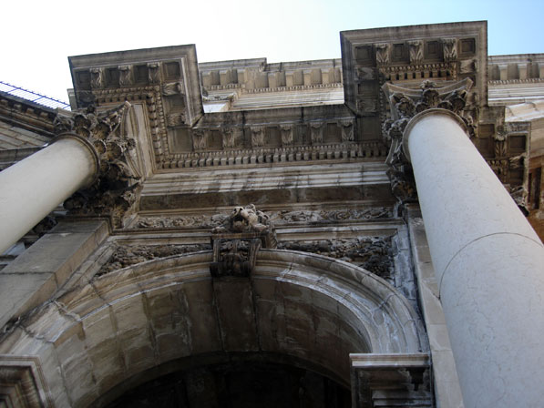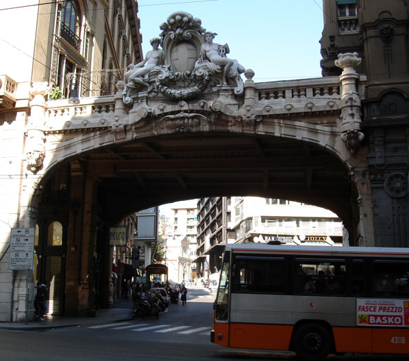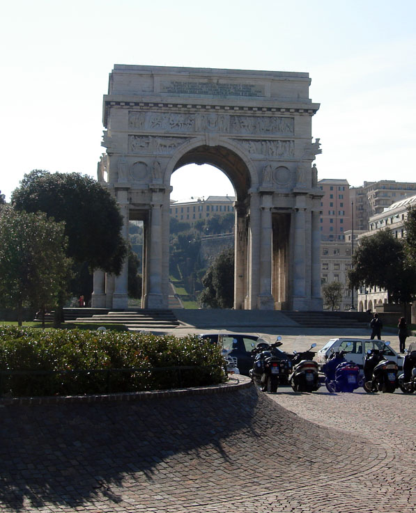 В среду около полудня мы с этим прекрасным местечком распрощались и были доставлены в другое, в центр Генуи, на площадь Победы, главным украшением которой является триумфальная арка, воздвигнутая не каким-нибудь из Цезарей, а Бенито Муссолини. Если присмотреться, можно даже различить пропеллер самолета, что есть верный признак – работа не древнеримская.