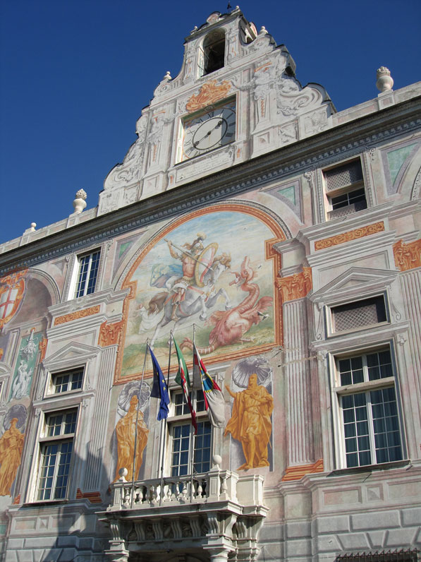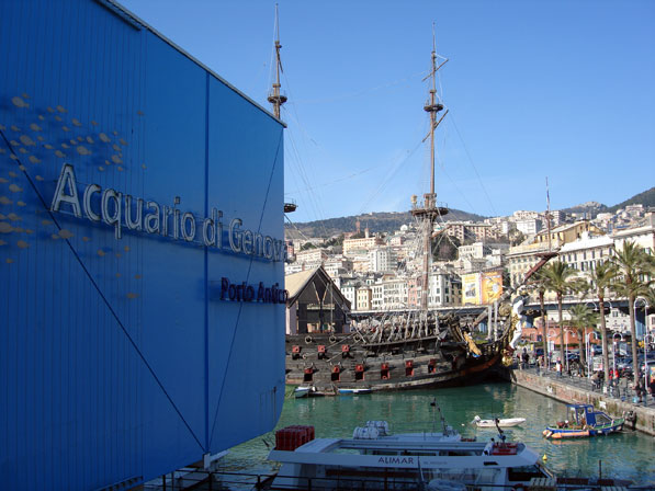 Постепенно мы добрели до портовой части города, точнее, Porto Antico. Море когда-то подступало ближе, прямо к зданию Биржи (свежеотреставрированной, с Георгием-победоносцем, в очередной раз пронзающим змия – от святого Георгия у Генуи и соответствующий флаг). Сейчас здесь много сувенирных и всяких иных лавочек, ну а непосредственно в море высится красавец Аквариум, между прочим, второй в Европе по величине. Посещение этого места произвело неизгладимое впечатление и рекомендую всем – будете в Генуе, не пожалейте 18 евро на билет в это чудесное место. Я, правда, прошел бесплатно ( :) ) по журналистской корочке, спасибо надоумившим коллегам.