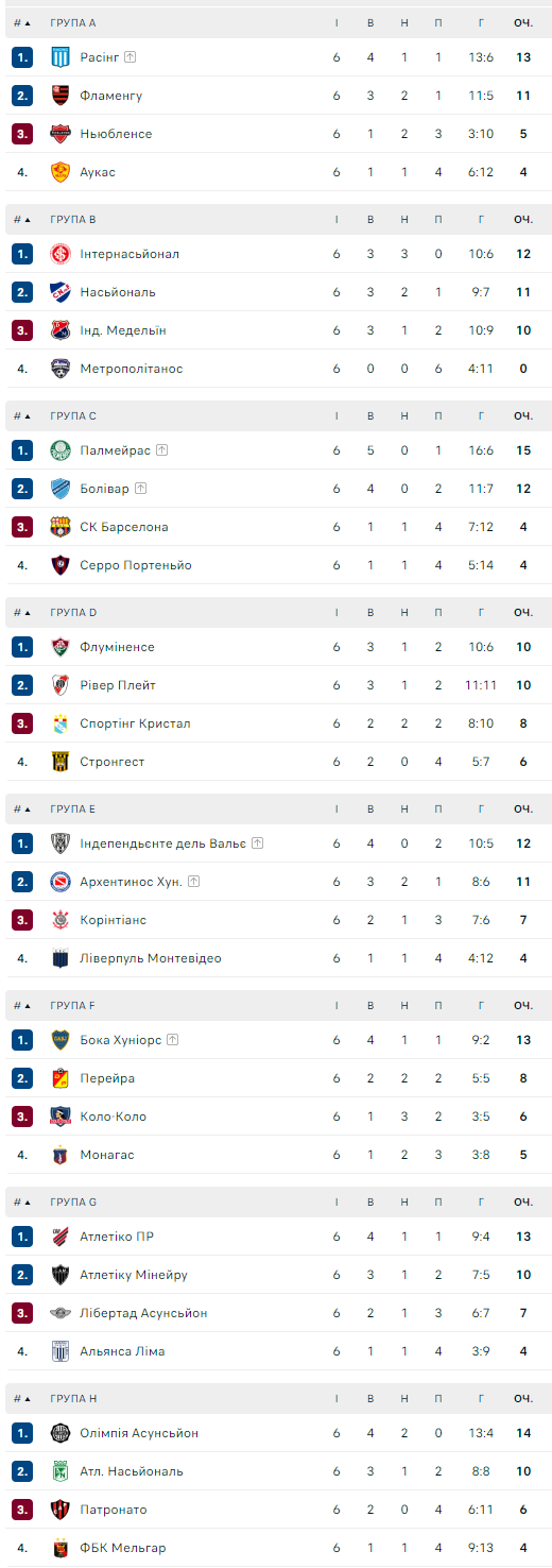 Завершен групповой этап Кубка Либертадорес. Итоговые таблицы групп