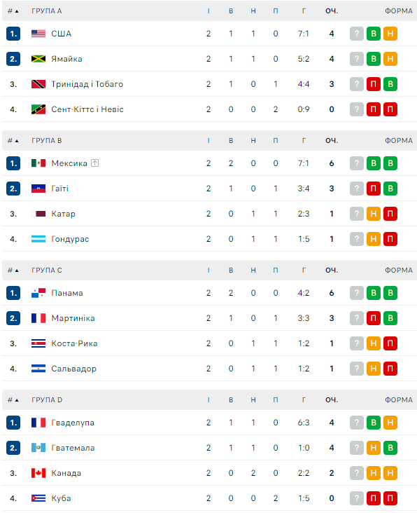 В лидерах своих групп – Панама (6 очков), Гваделупа и Гватемала (по 4).