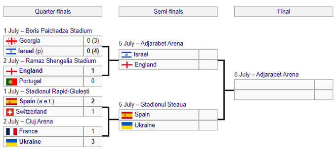 - 🔹 1 июля. 19:00. Грузия – Израиль – 0:0 (пен. 3:4)