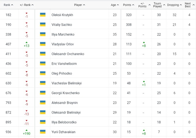 Что касается украинцев, то практически все немного опустились в рейтинге. На 13 позиций поднялся Владислав Орлов, Юрий Джавакян вернулся в тысячу лучших.
