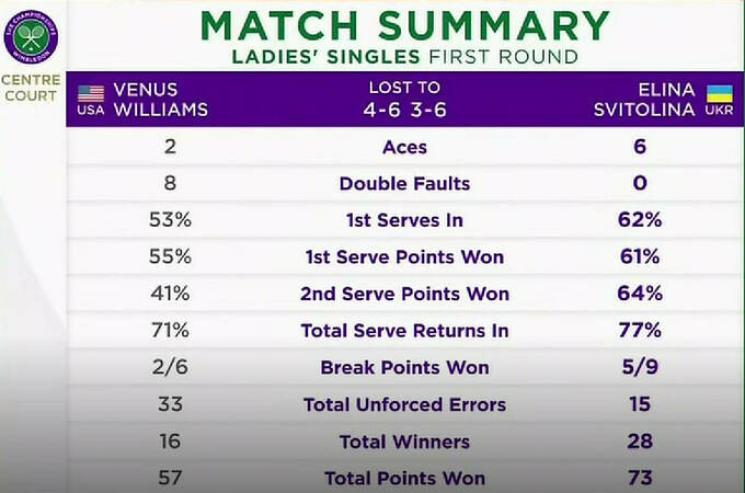 Moving on to the second round.@ElinaSvitolina beats five-time champion Venus Williams, 6-4, 6-3#Wimbledon pic.twitter.com/0JXnOuFxFX