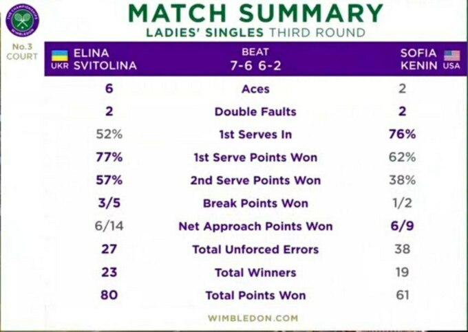 Excellent Elina ✨@ElinaSvitolina defeats Sofia Kenin 7-6(3), 6-2 to advance to the fourth round 👏#Wimbledon pic.twitter.com/QFBlH7OY8j