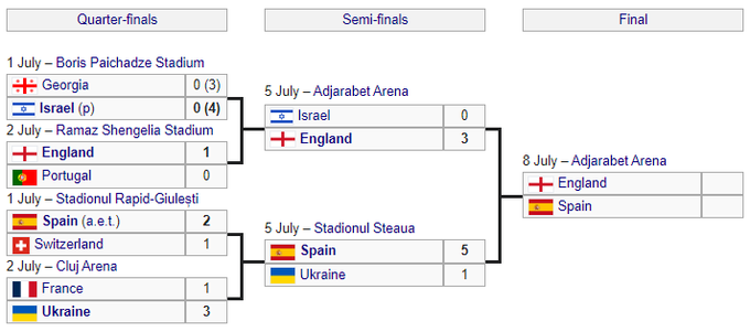 В полуфиналах Англия обыграла Израиль (3:0), а Испания разгромила Украину (5:1).
