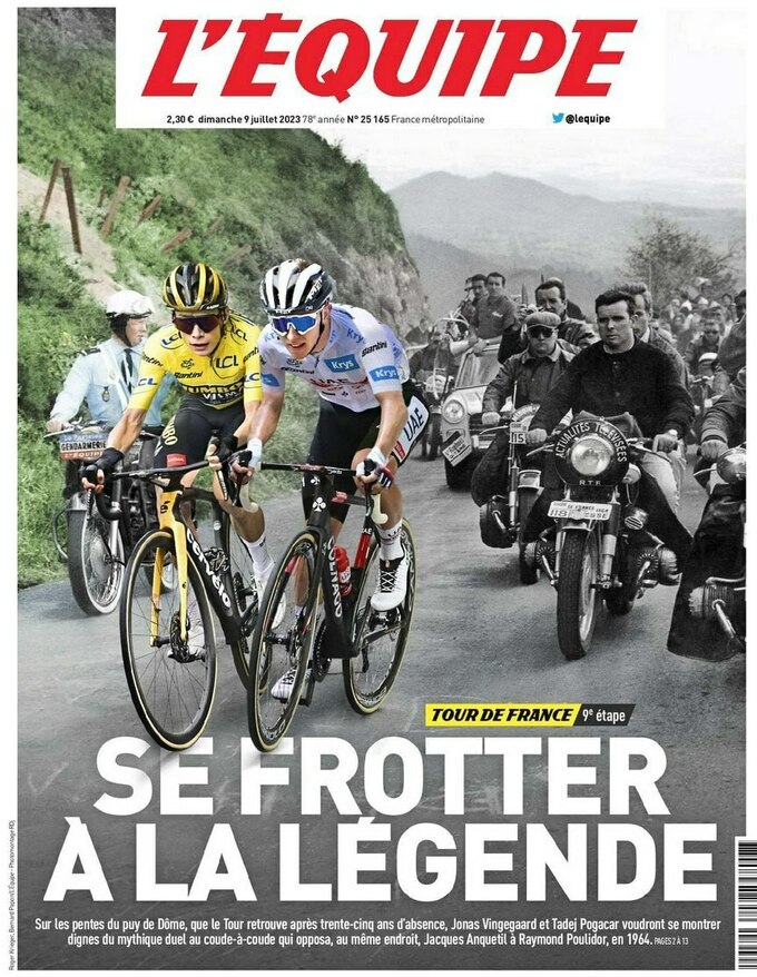 Завершал программу первой недели Тура горный финиш до Пюи де Дом – живописного подъема, который был классическим для «Большой петли» в 20-м веке и подарил не одну великую битву легендарных гонщиков, однако не попадал на карту Тура аж с 1988 года. По случаю возвращения легенды французская газета «L’Equipe» на первую страницу вынесла переделанное фото с легендарной дуэли на Пюи де Дом 1964 года, где вместо Жака Анкетиля и Раймона Пулидора изображены главные герои Тура современной эпохи.
