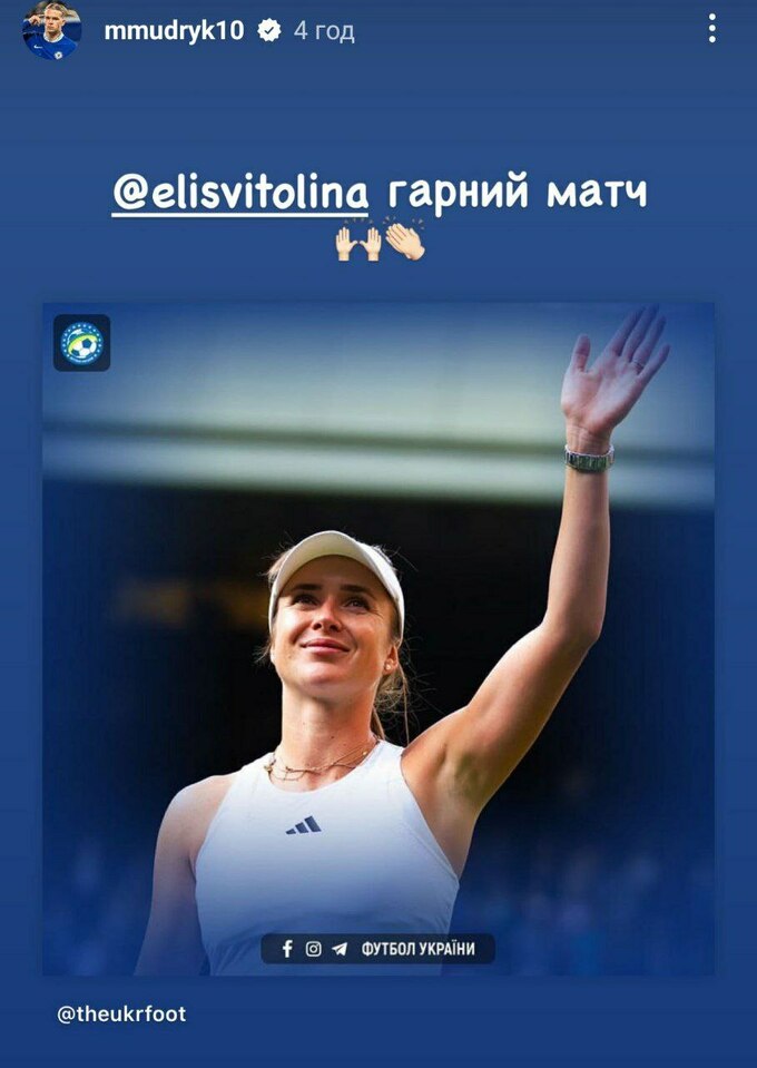 Украинский вингер лондонского «Челси» Михаил Мудрик поздравил Элину Свитолину с успешной игрой в матче 1/4 финала Уимблдона-2023 против Иги Свентек: